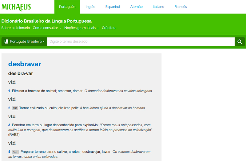 No dicionário online Michaelis o significado da palavra desbravar está assim: