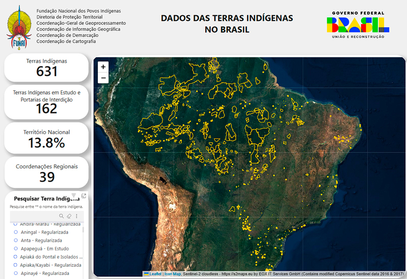 Painel criado pela Coordenação Geral de Geoprocessamento (CGGEO), para facilitar a consulta aos dados das terras indígenas no Brasil. Nele você pode consultar a quantidade de terras indígenas, visualizar os limites, verificar a quantidade de terras por fase administrativa e por estados, além de consultar demais dados espaciais para download.