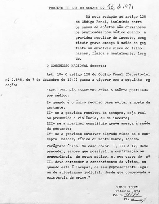Apenas em 1971, no auge da ditadura militar, o Senado tratou do tema pela primeira vez. A discussão foi deflagrada pelo senador governista Vasconcelos Torres (Arena-RJ), que escreveu um projeto de lei prevendo a ampliação dos casos de aborto legal.