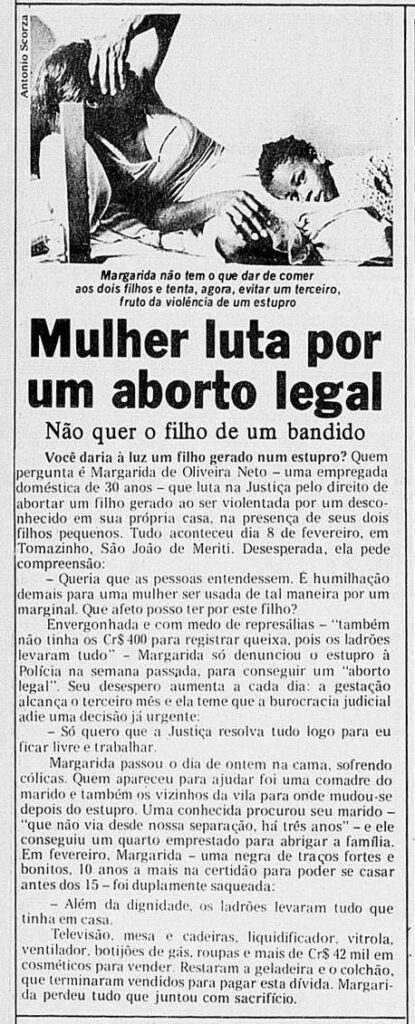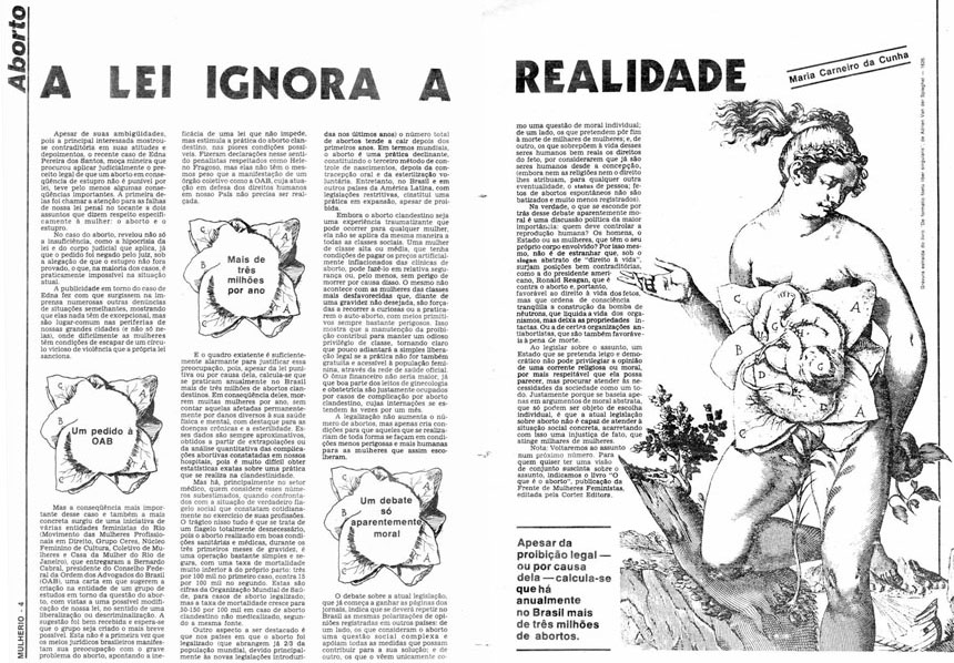 — Quanto às mulheres pobres, recorrem a métodos caseiros ou submetem-se a perigosas manobras em mãos leigas. O INPS [Instituto Nacional de Previdência Social] calcula em 500 mil o número de atendimentos de sequelas de abortos malfeitos, que resultam em hemorragias e infecções. Sei de pacientes humildes que foram sadicamente curetadas a sangue frio, “para aprender”.