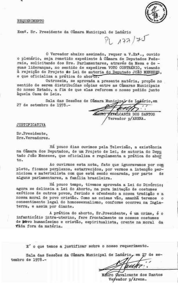 Em 1980, o Senado recebeu manifestos de duas assembleias legislativas (a do Pará e a de Minas Gerais) e de 37 câmaras municipais (entre elas, a do Recife) pressionando os senadores a não aprovar nenhum projeto de liberação do aborto.